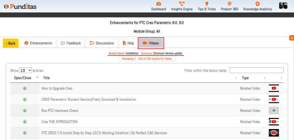 Punditas AI Advisor also offers Video Tutorials for every enhancement to help Users learn how to use the feature in Creo Parametric software. The image below shows the related videos for “Installation” that has been updated in Creo 8.0.9.0. These Videos are extracted and curated by Punditas AI engine from 10’s of repositories including PTC’s Learning Connector, YouTube, Vimeo, etc.