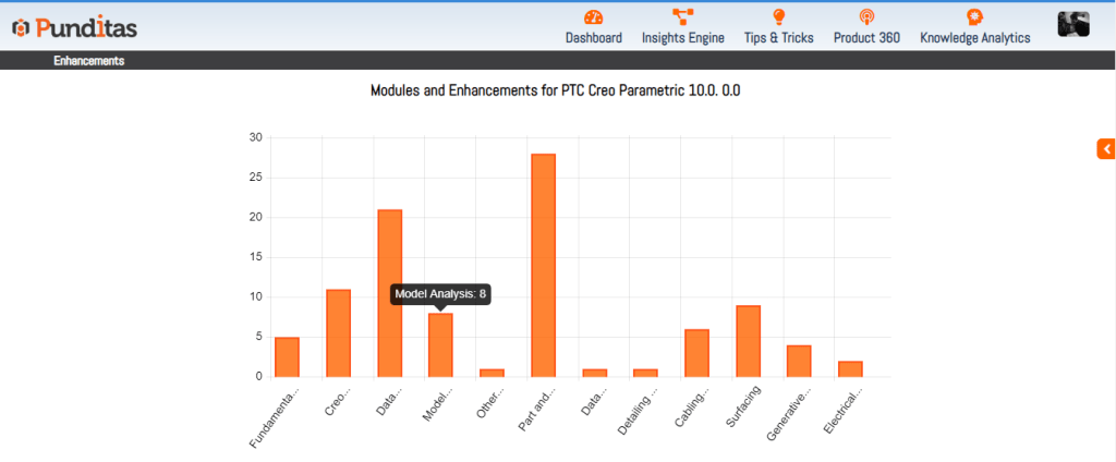 Punditas AI improves the user experience by providing an intuitive visual representation of Creo data with its cutting-edge chart view function. The relationship between modules and the number of enhancements is graphically represented for users by this dynamic chart.