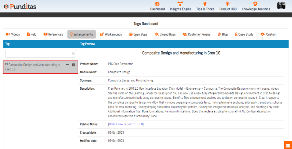 Punditas AI enables you to categorize important data such as videos, help articles, enhancements, workarounds, bugs, reference documents, blogs, case studies, customer presentations, and more. You can then save this valuable Creo information for future reference and use.