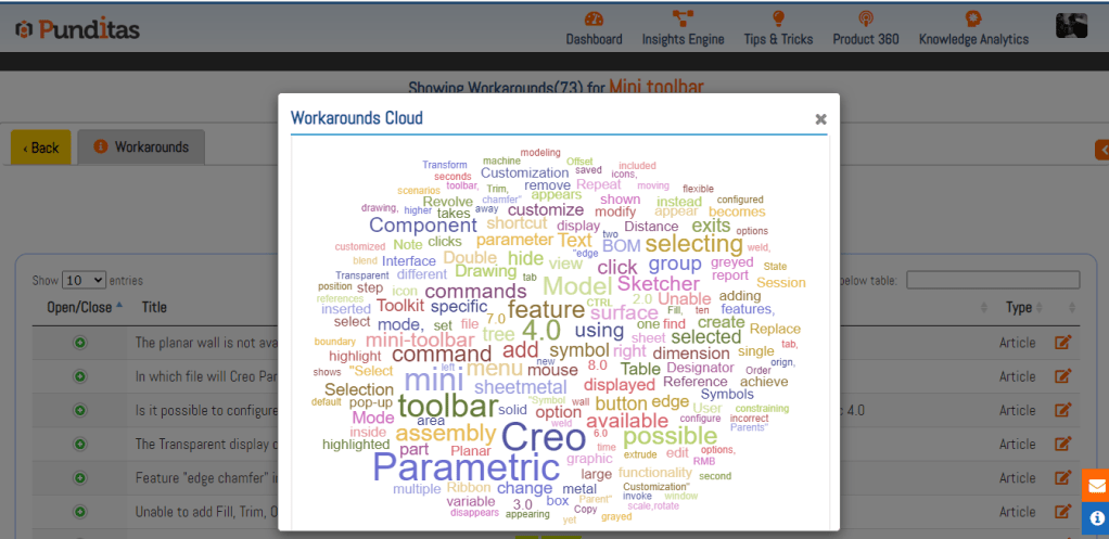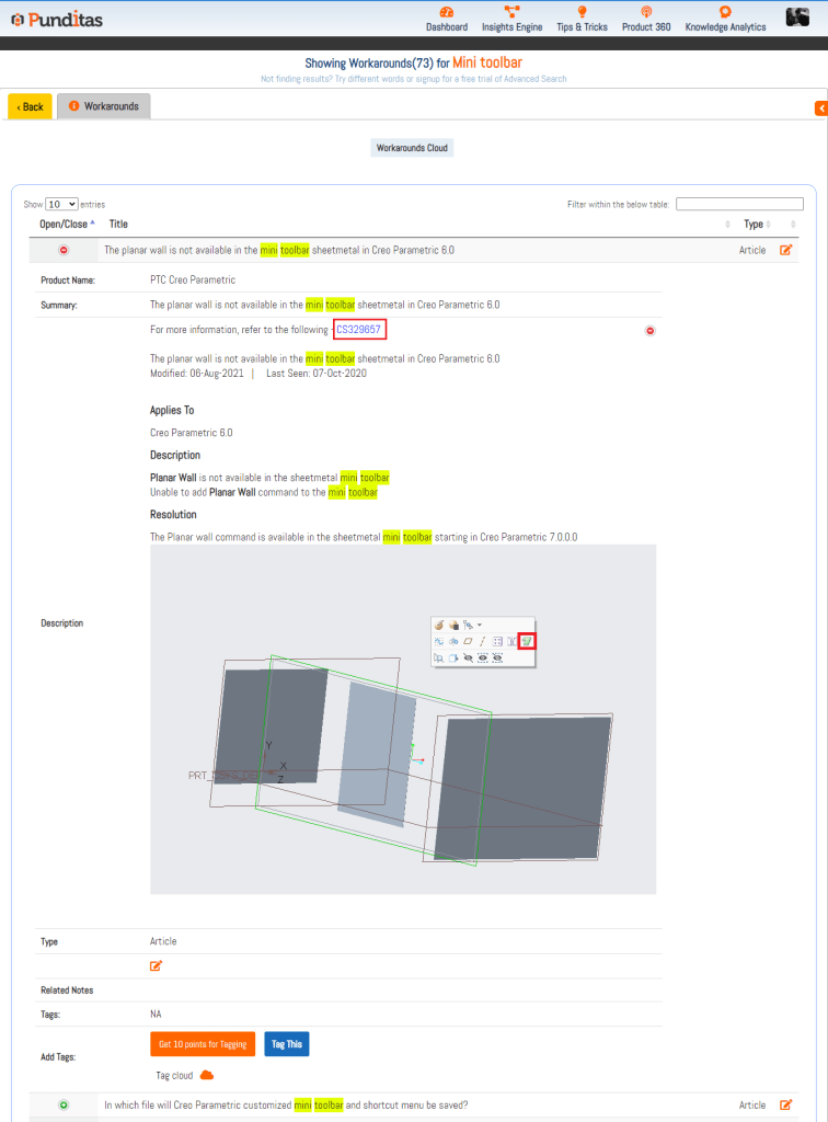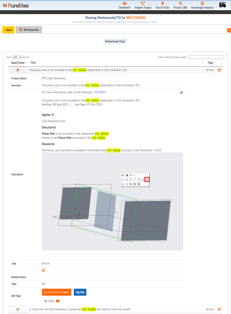 Within Punditas AI, you’ll find an extensive collection of PTC Creo-related Customer Support (CS) articles, conveniently organized under the Workarounds node. When you search for any Creo topic, Punditas will promptly retrieve the most relevant search results from its comprehensive database.