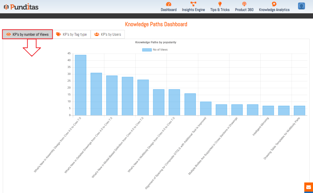 Step 3 :- KP’s by number of Views tab Shows the number of times a Knowledge Path (Shared information) is viewed, Graphical representation of Shared “Knowledge Paths” vs “Number of Views” displays as described below in the Image