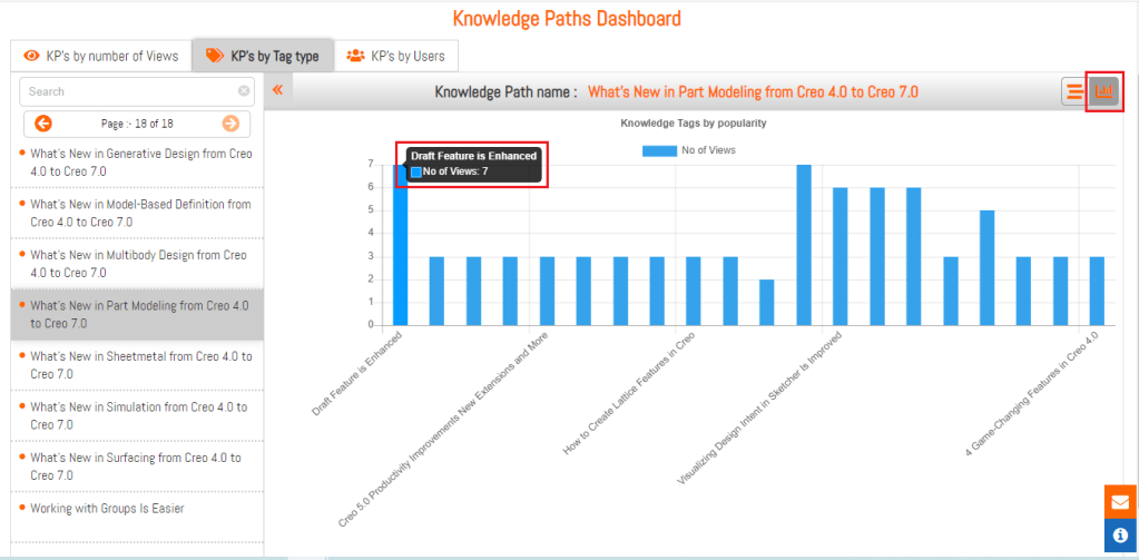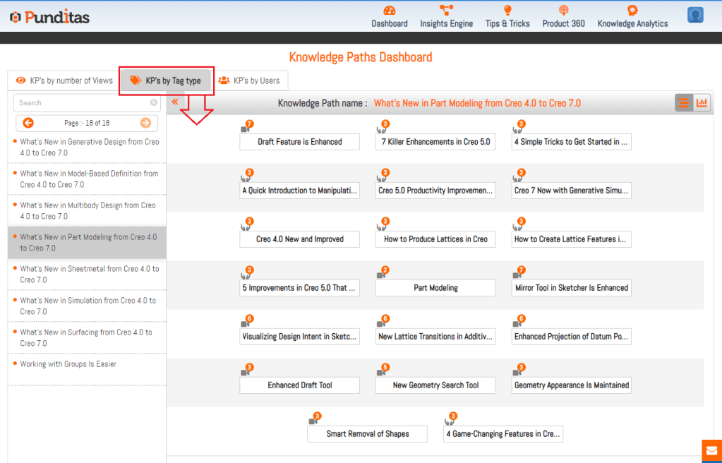 The below image displays List view of KP’s by Tag type for the shared Knowledge Path :- What’s New in Part Modeling from Creo 4.0 to Creo 7.0 where Draft Feature is Enhanced video tutorial tag viewed 7 times