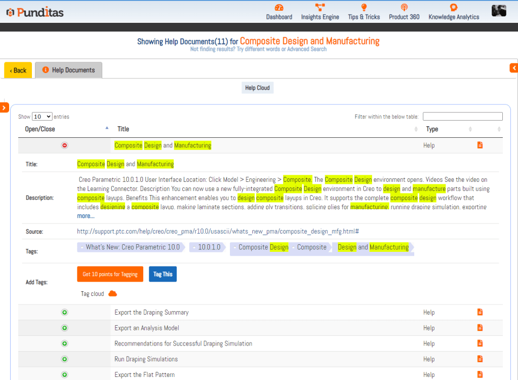 Perspective-Based Information Retrieval: Punditas AI adopts a perspective-based system, gathering data from reputable sources and categorizing Creo information into sections such as Video Tutorials, Help Documents, Enhancements, Open & Closed Bugs, Workarounds, General Presentations, Customer Presentations, Discussions, Blogs, Case Studies, and more.