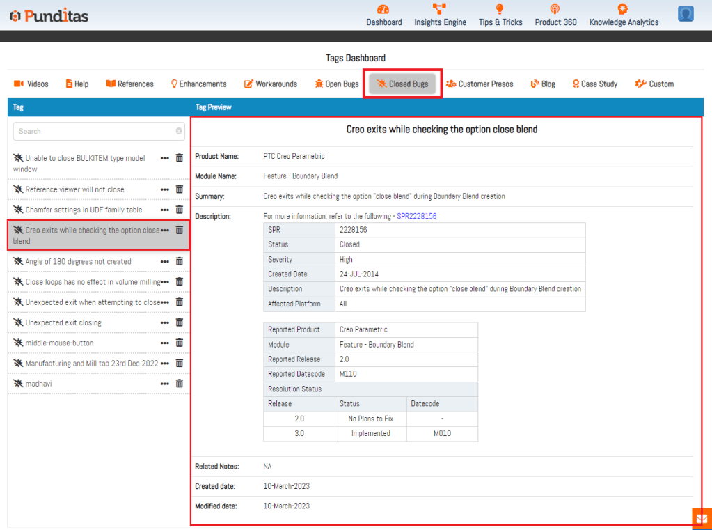 With Punditas AI, you have the ability to tag your crucial data, preserving Creo information for future reference. This includes saving various types of content such as videos, help articles, enhancements, workarounds, bugs, reference documents, blogs, case studies, customer presentations, and more.