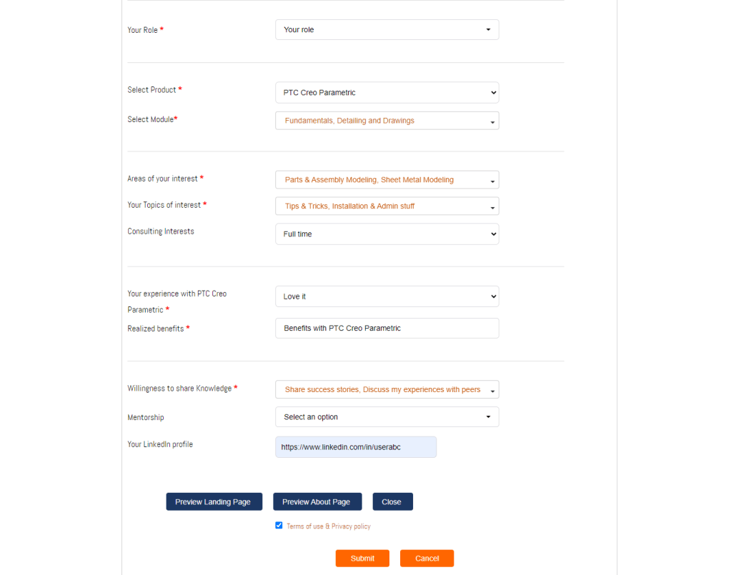 Step 5 :- Provide all the required information such as Your Role, Areas of your Interest, Your experience, Your LinkedIn profile etc. Information given by you will be visible to all the PTC Creo users Worldwide once you Submit the Profile