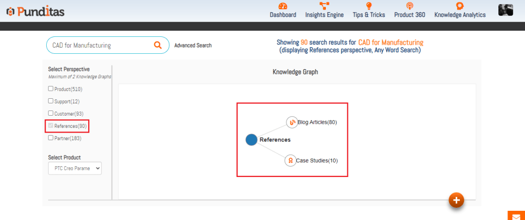 Through the References Perspective feature, Punditas AI offers a curated selection of blogs and case studies tailored to the chosen “Product” (For example, Creo, Windchill, ThingWorx etc.) ensuring users have access to relevant and insightful content.