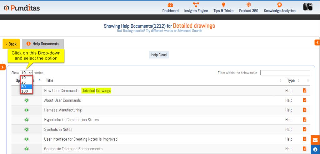 Customization is key to a tailored learning experience. Punditas AI offers four options for entry selection, allowing users to display 10, 25, 50, or 100 Help articles per page. This flexibility empowers users to navigate through the extensive library of help documents with ease.