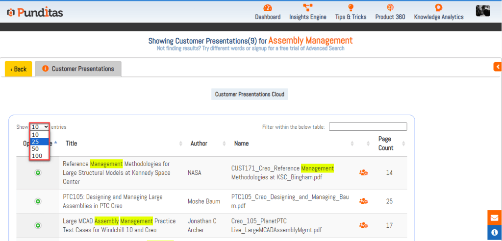 Customize your viewing experience with Punditas AI’s flexible entry selection options, empowering users to display 10, 25, 50, or 100 Customer Presentations per page. This flexibility ensures efficient navigation through the extensive library of Customer Presentations.