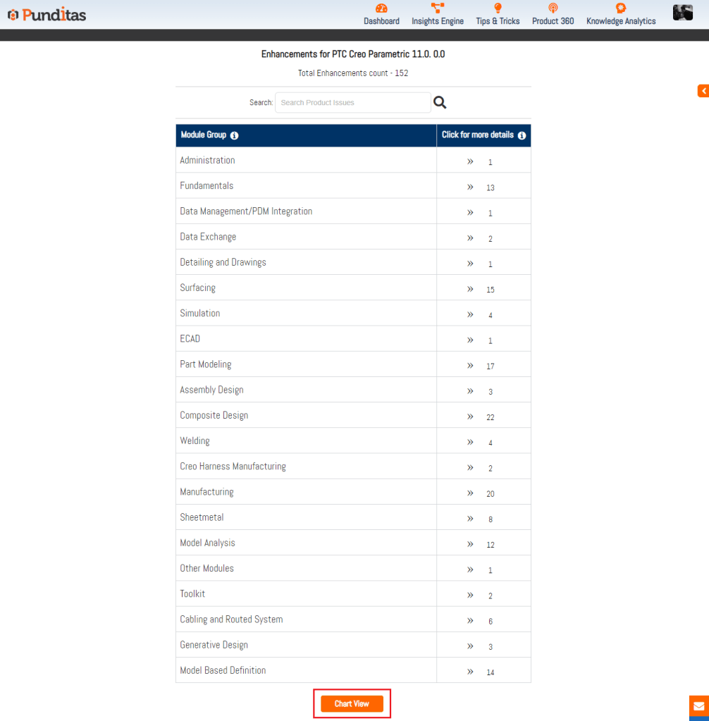 Punditas AI’s Chart View feature provides users with a dynamic and graphical representation of product data. This includes illustrating the relationship between different modules within a software product and showcasing the number of enhancements associated with each module. Unlike traditional text-based reports, the Chart View adds a visual dimension to data analysis, making complex information easier to understand at a glance.