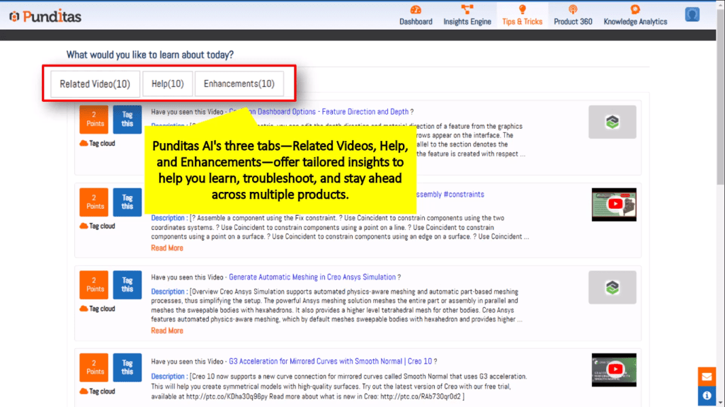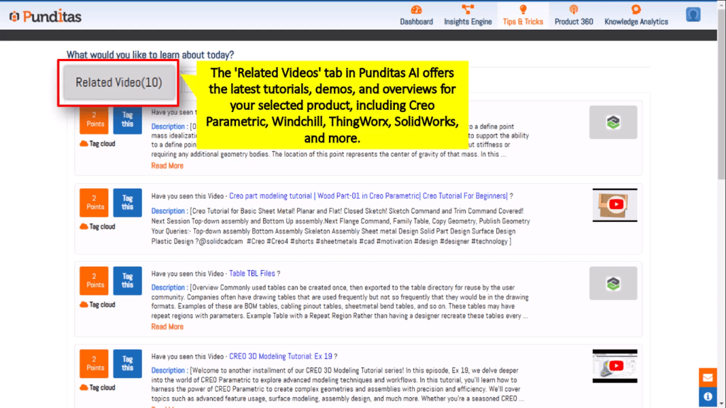 The Punditas AI Tips & Tricks module features three key tabs: Related Videos, Help, and Enhancements. Each tab is tailored to improve your understanding and usage of CAD tools. Let’s explore these components in detail to unlock your full potential.