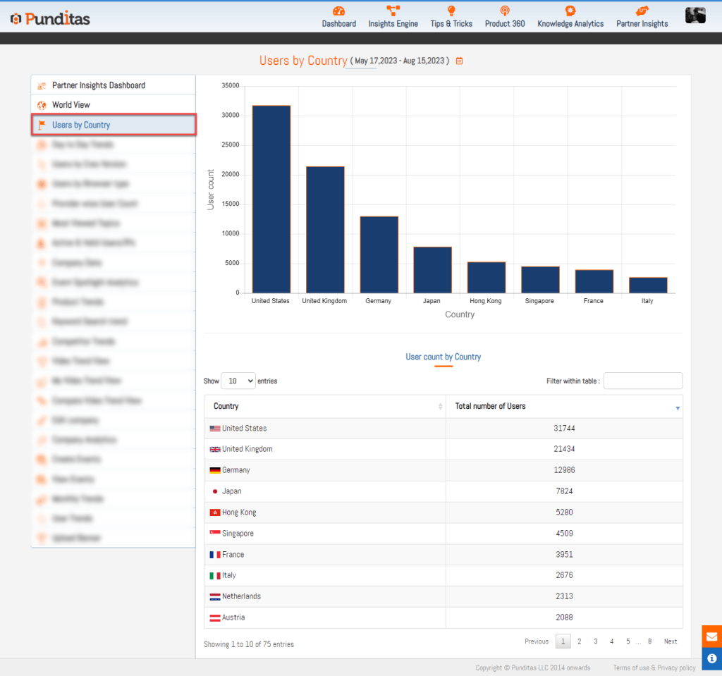 The “Users by Country” section in Punditas AI provides both graphical and tabular representations of Creo user distribution across various countries. This feature is designed to give you a clear and actionable understanding of global engagement with Creo.