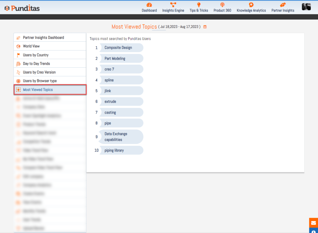 The “Most Viewed Topics” section on Punditas AI offers a carefully curated list of the top ten most frequently accessed Creo terms by companies and users. This feature provides a pulse on what subjects are capturing the most attention, empowering businesses with actionable insights.