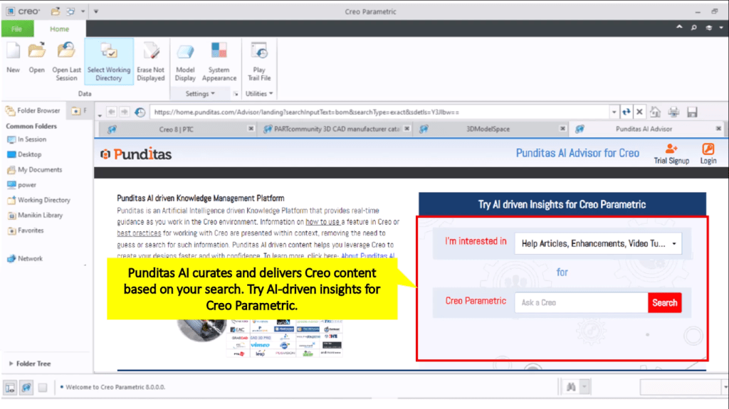 Punditas AI Advisor provides in-context guidance as users work within the Creo environment. This eliminates the guesswork by presenting information on how to use specific features or adopt best practices.