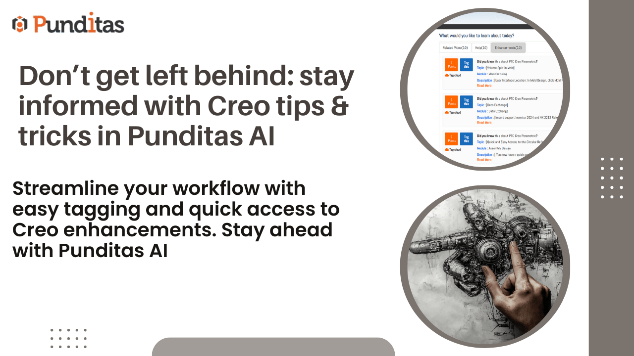 Punditas AI Advisor provides real-time guidance as you work in the Creo environment. Information on “how to use” a feature in Creo or best practices for working with Creo are presented within context, removing the need to guess or search for such information. Punditas AI driven content helps you leverage Creo to create your designs faster and with confidence.