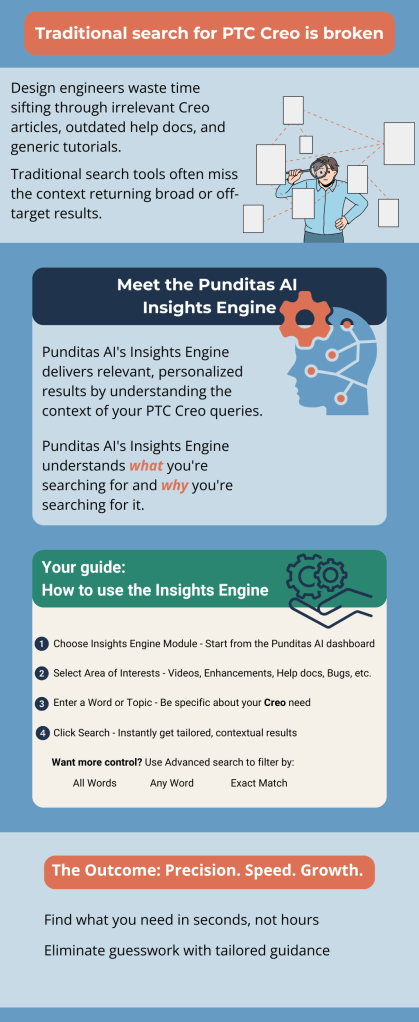 Unlike traditional search tools that rely on simple keyword matching, the Punditas Insights Engine uses context-aware AI to understand what you actually mean—and what you need next. Here’s how it redefines the search experience for PTC Creo users and design engineers.