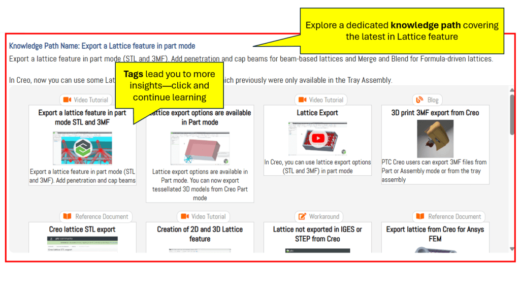 The Knowledge Graph creates a visual map of all content related to your current task. So if you’re in Part Mode and working on Lattice Export, you’ll see: