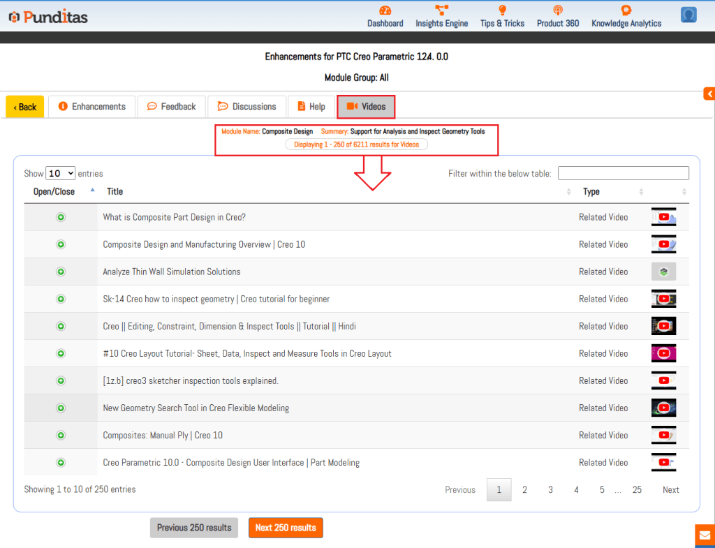 Punditas AI Advisor also offers Video Tutorials for every enhancement to help Users learn how to use the feature in Creo Parametric software. The image below shows the related videos for “Composite Design” that has been updated in Creo 12.4.0.0. These Videos are extracted and curated by Punditas AI engine from 10’s of repositories including PTC’s Learning Connector, YouTube, Vimeo, etc.