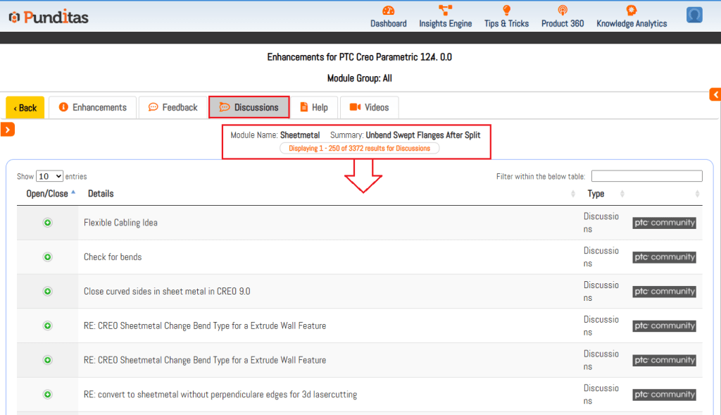 Punditas AI Advisor is a powerful platform as Users can access a single source of community chatter (discussions, opinions, suggestions) from both PTC and non-PTC sources. The image below shows discussions from PTC community related to “Sheetmetal” enhancement in Creo 12.4.0.0
