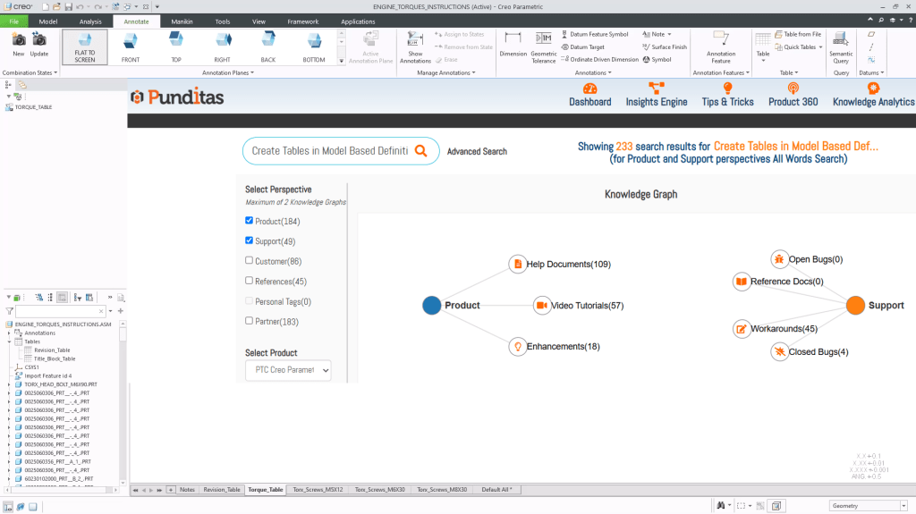 Punditas AI’s Knowledge Graph aggregates every reliable source around your task—from community tips to PTC documentation—and visually maps it for easy access. Whether you’re defining GD&T, adding BOMs, or adjusting table placement, you get quick answers from trusted, AI-ranked content.