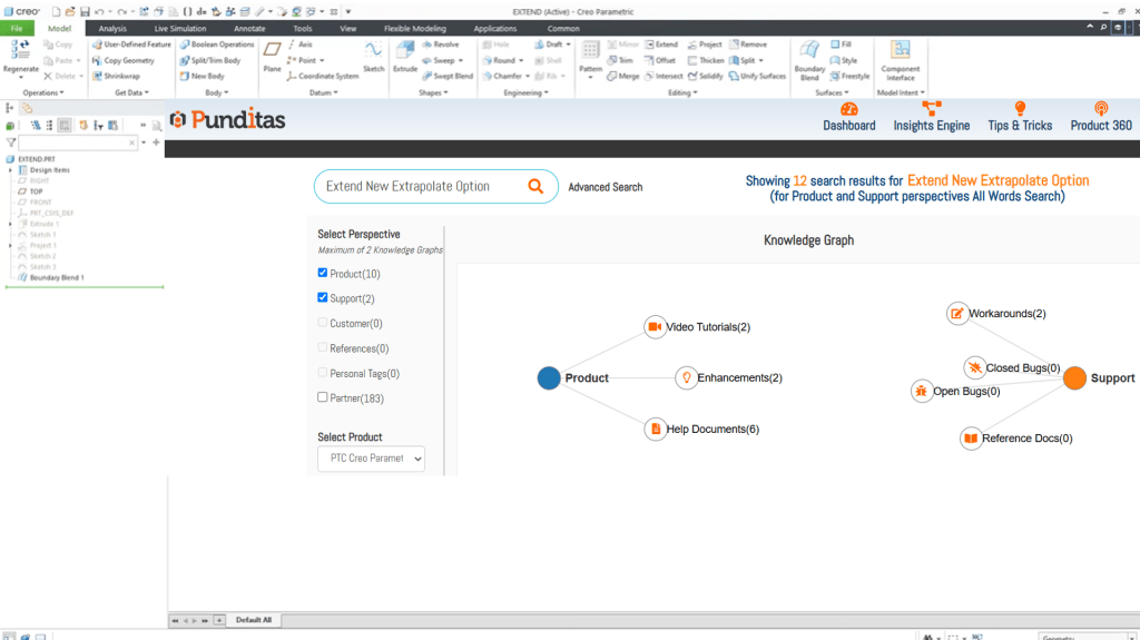 When you work in Creo, Punditas runs silently in the background—detecting what feature you’re using, what problem you’re trying to solve, and then instantly surfaces only the most relevant, up-to-date insights. For example: