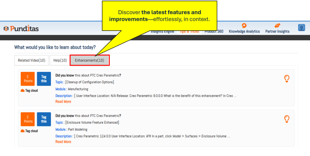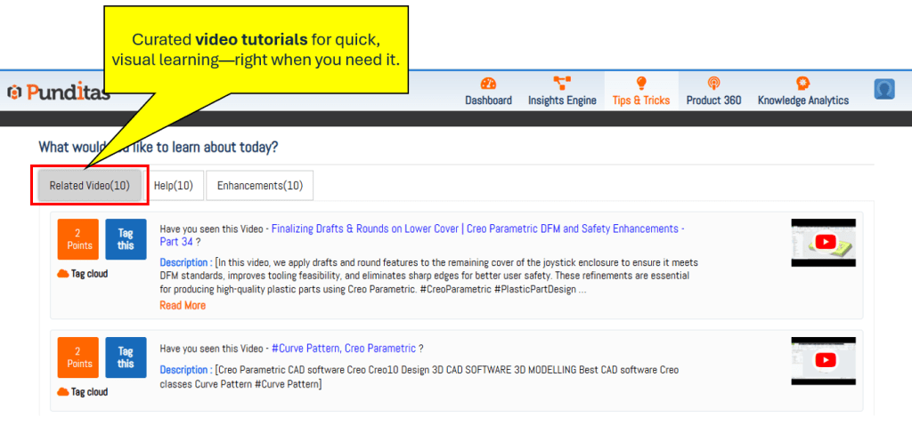 The Tips & Tricks module within Punditas AI is designed specifically to bridge the information gap between Creo’s powerful new features and the engineers using them. Instead of requiring users to go out and search for resources, Punditas AI brings the learning into the Creo environment itself.