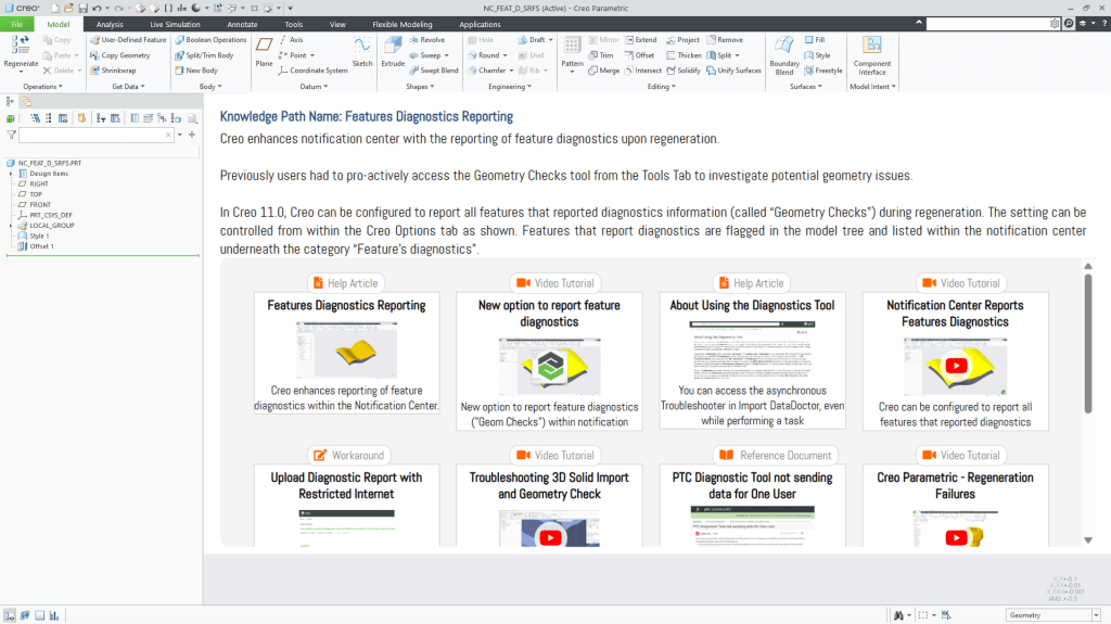 With the new Feature Diagnostics reporting capability in Creo 11, this friction is eliminated. Users can now configure Creo to report all diagnostic messages related to geometry checks during regeneration. These flagged features are not only visible in the Notification Center but are also marked directly in the Model Tree, offering instant visual feedback.