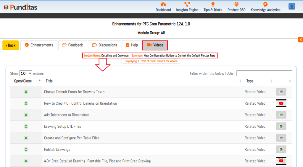 Punditas AI Advisor also offers Video Tutorials for every enhancement to help Users learn how to use the feature in Creo Parametric software. The image below shows the related videos for “New Configuration Option to Control the Default Plotter Type” that has been updated in Creo 12.4.1.0. These Videos are extracted and curated by Punditas AI engine from 10’s of repositories including PTC’s Learning Connector, YouTube, Vimeo, etc.