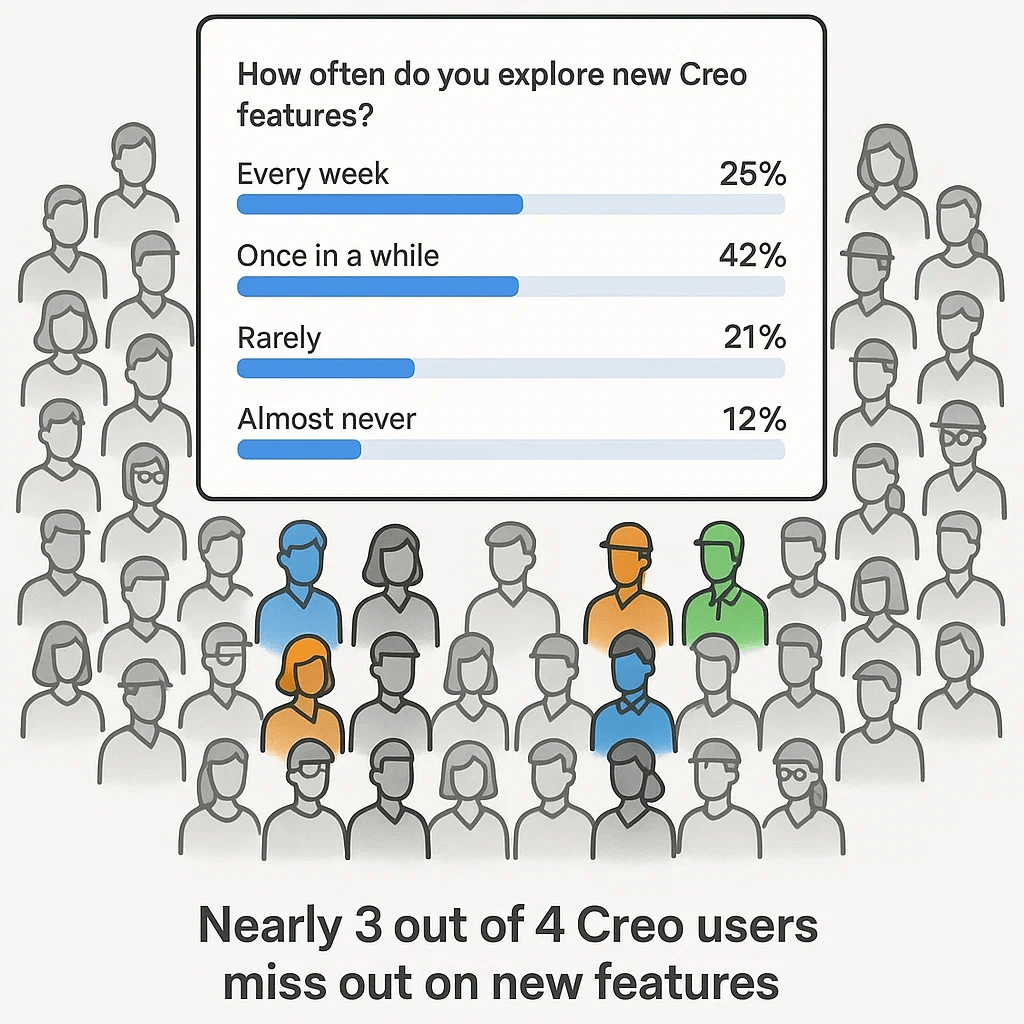 📊 That means nearly three out of four Creo users are missing out on new features and enhancements. The reason? Lack of time and no single place to find the right resources.