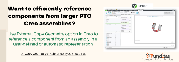 Use External Copy Geometry option in Creo to reference a component from an assembly in a user-defined or automatic representation UI: Copy Geometry > Reference Type > External ptccreo.punditas.com