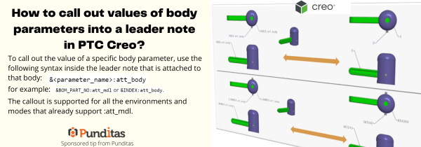 To call out the value of a specific body parameter, use the following syntax inside the leader note that is attached to that body: &<parameter_name>:att_body for example: &BOM_PART_NO: att_mdl or &INDEX: att_body The callout is supported for all the environments and modes that already support :att_mdl. ptccreo.punditas.com