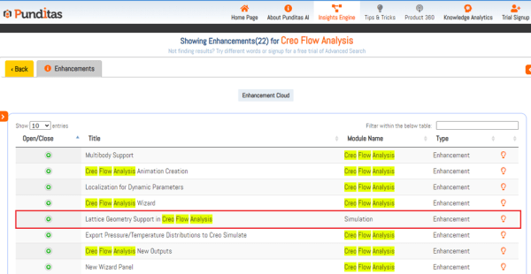 Punditas AI displays the comprehensive list of improvements, new features and capabilities related to Creo Parametric or any other Enterprise Software. As an example, searching for "Creo Flow Analysis" displays all the available enhancements in the Punditas Knowledge Graph as shown below. Follow the below steps to review all Enhancements pertaining to the search term... Continue Reading →